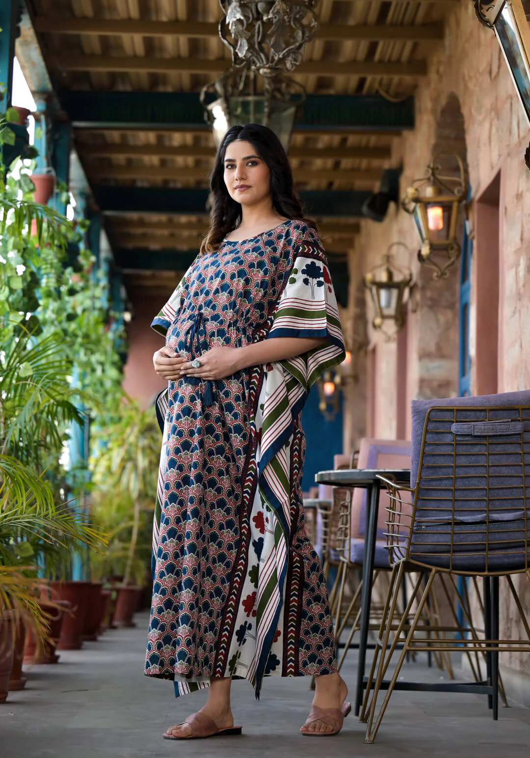 Indigo Multi Ethnic Motifs Print Maternity & Feeding Kaftan Dress with Concealed Zipper